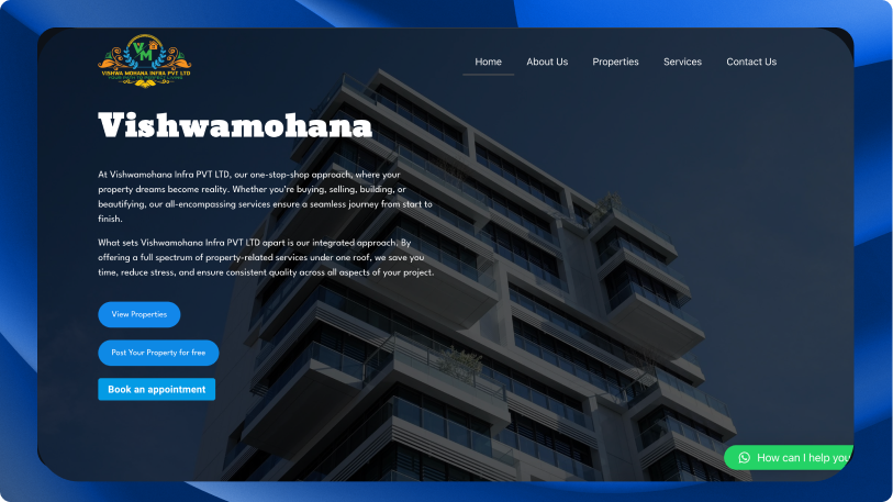 I created this portfolio website for Vishwamohana Pvt Ltd, a real estate company based in Andhra Pradesh and Karnataka. The site showcases their projects, services, and expertise with a clean, modern design. It features smooth navigation and a responsive layout for an optimal experience across all devices.